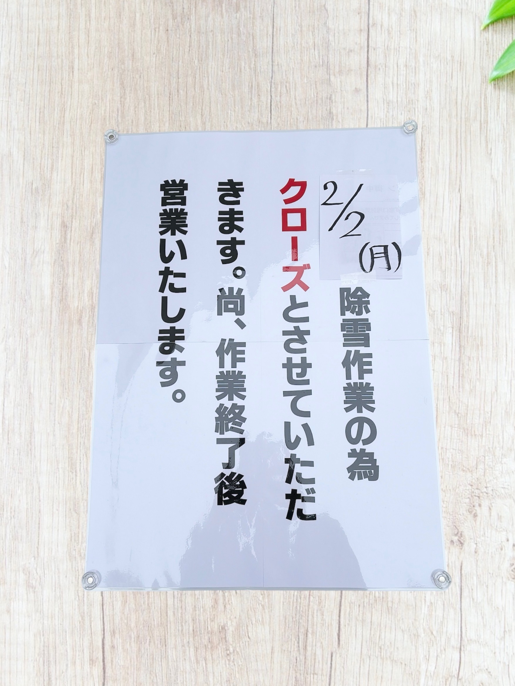 2月2日㈪除雪作業の為、クローズ致します。尚、作業終了後 営業致します。 ご理解ご協力の程お願い致します。
