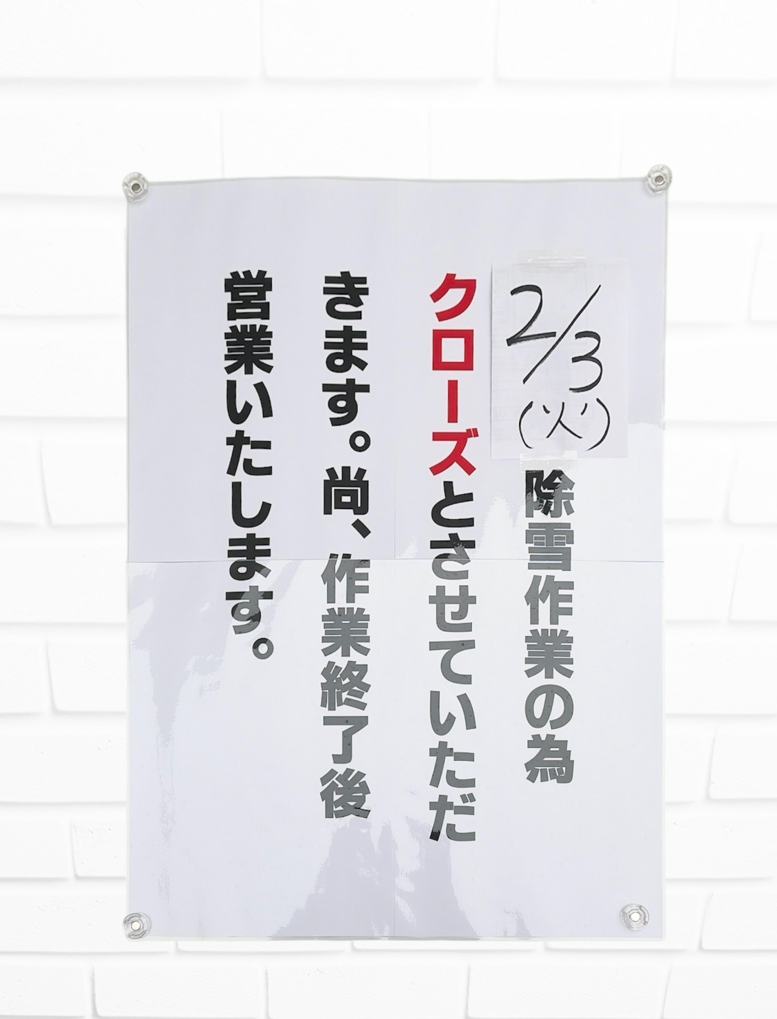 2月3日㈫も大雪による除雪作業を行いますので、クローズ致します。 尚、作業終了次第営業致します。(午後オープン予定) ご理解ご協力の程よろしくお願い致します。