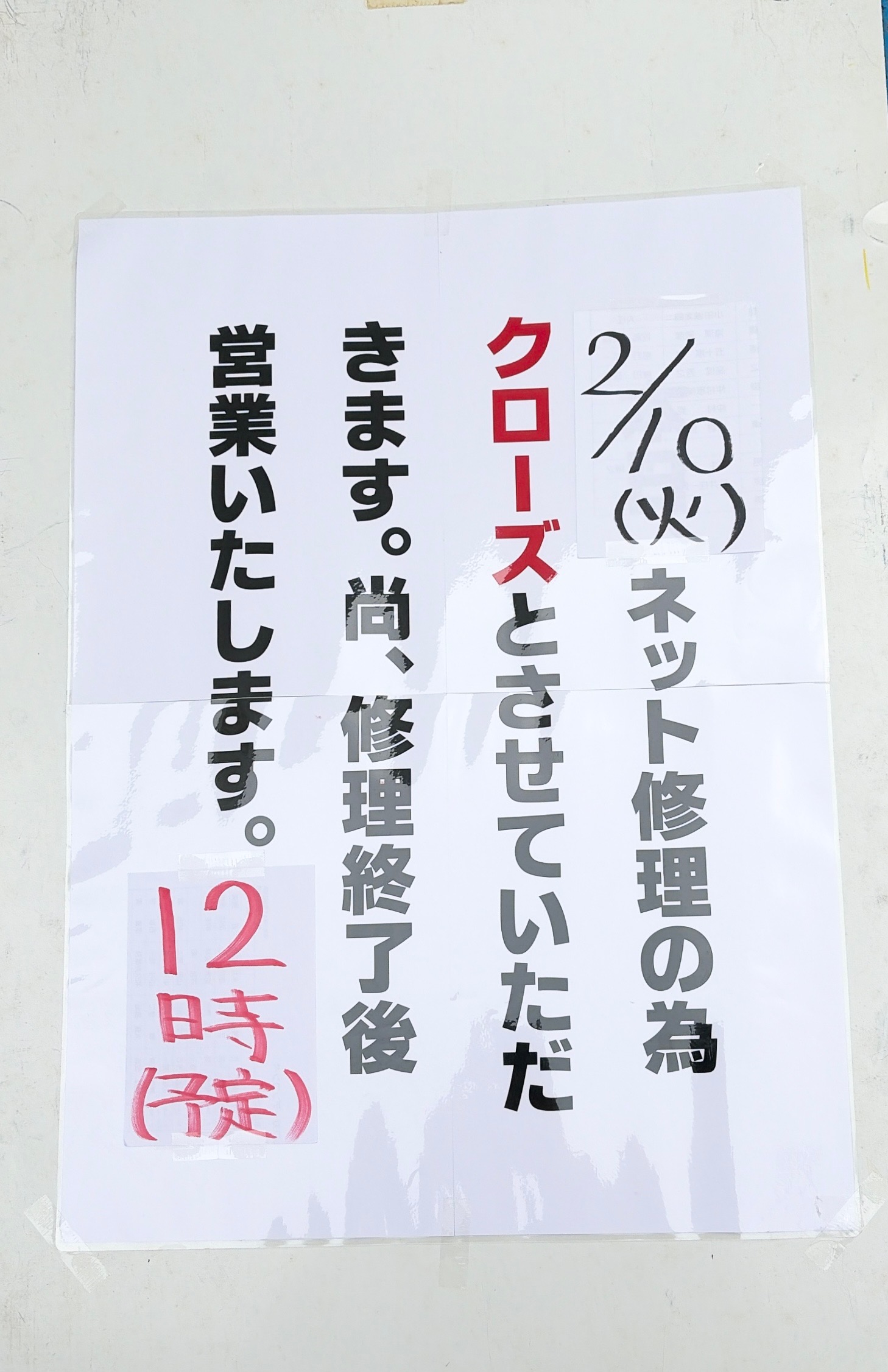 2月10日㈫ネット修理の為クローズ致します。 尚、修理終了後営業致します。
